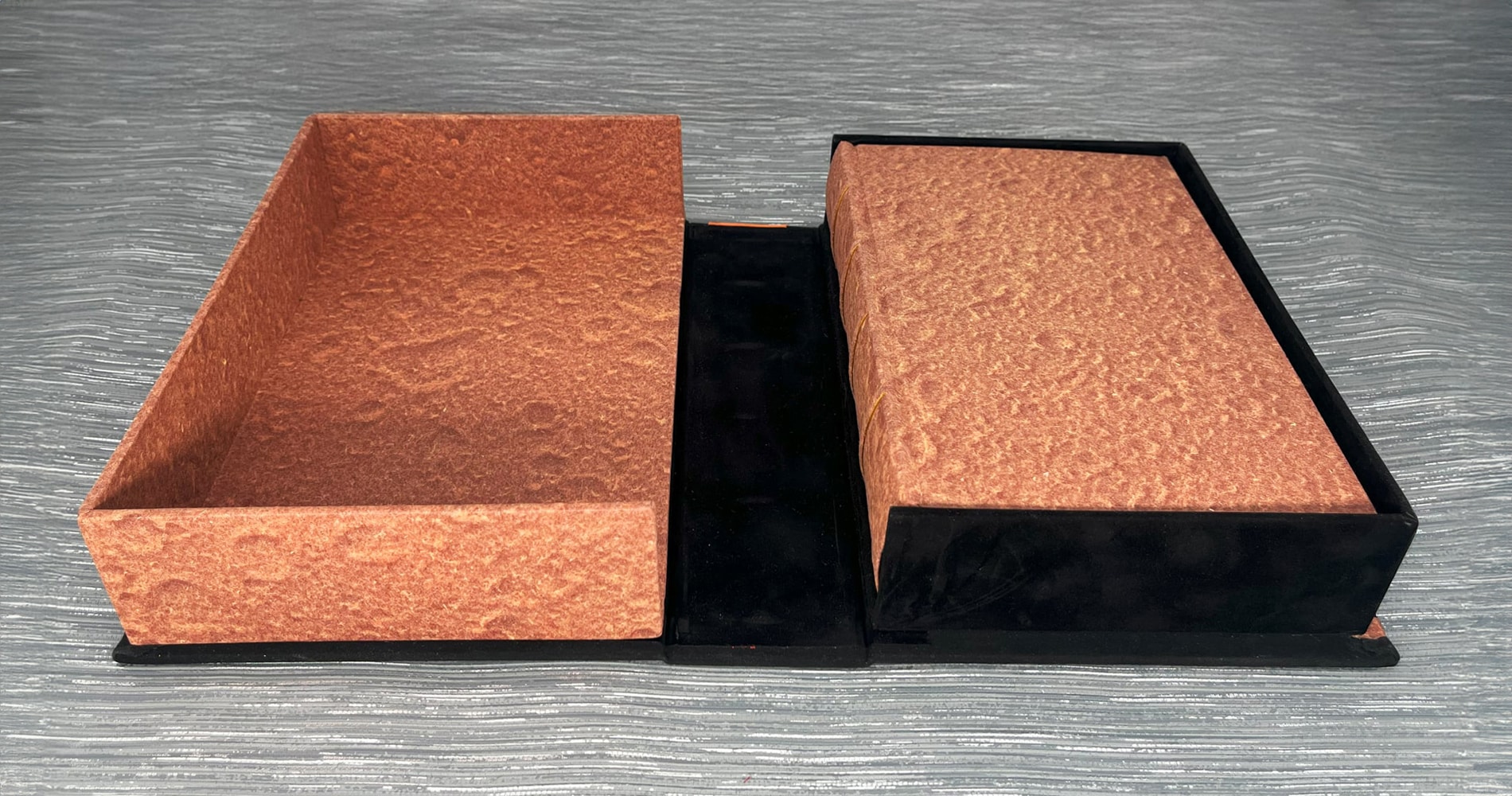 Exterior trays are also bound in the Martian paper and black suedel. We are also planning to add a few extra touches to the inside for the final version!