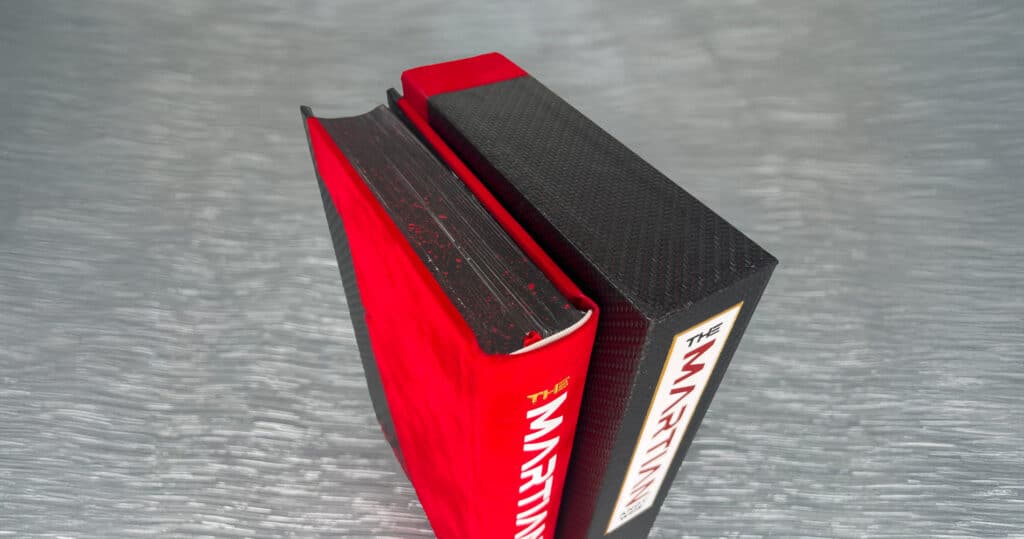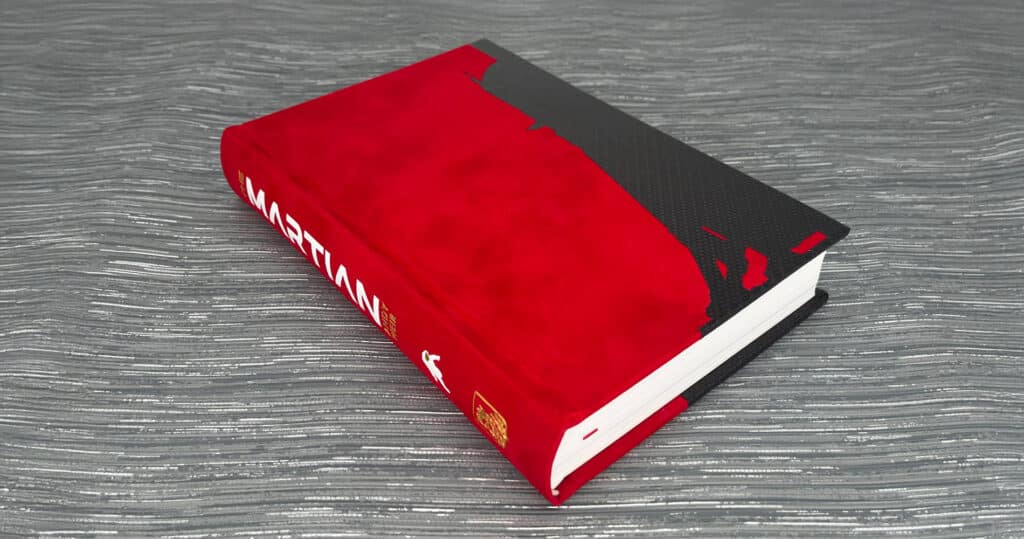 The Solander has been bound in a black Alcantara with two large onlays across the base with another alcantara colour and the Martian paper. The design depicts humanity’s attempt to rescue the lonely Watney from the surface of Mars. There are also three colours of hot foil stamping utilised on the box.
