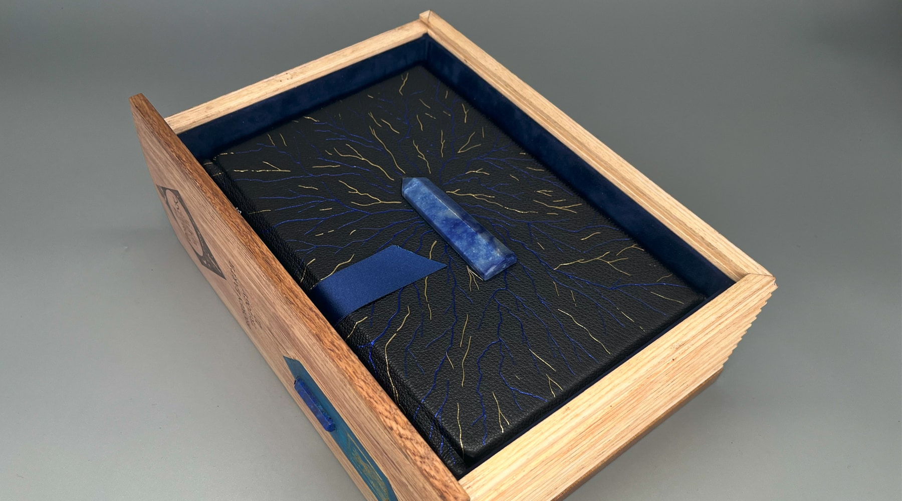 The case is a custom hand-made wooden box by expert box maker Peter Canham. The lid is made out of four pieces of wood to ensure no warping in humidity. It also has a unique blue stone embedded within the wood and will be laser etched with the author and title.