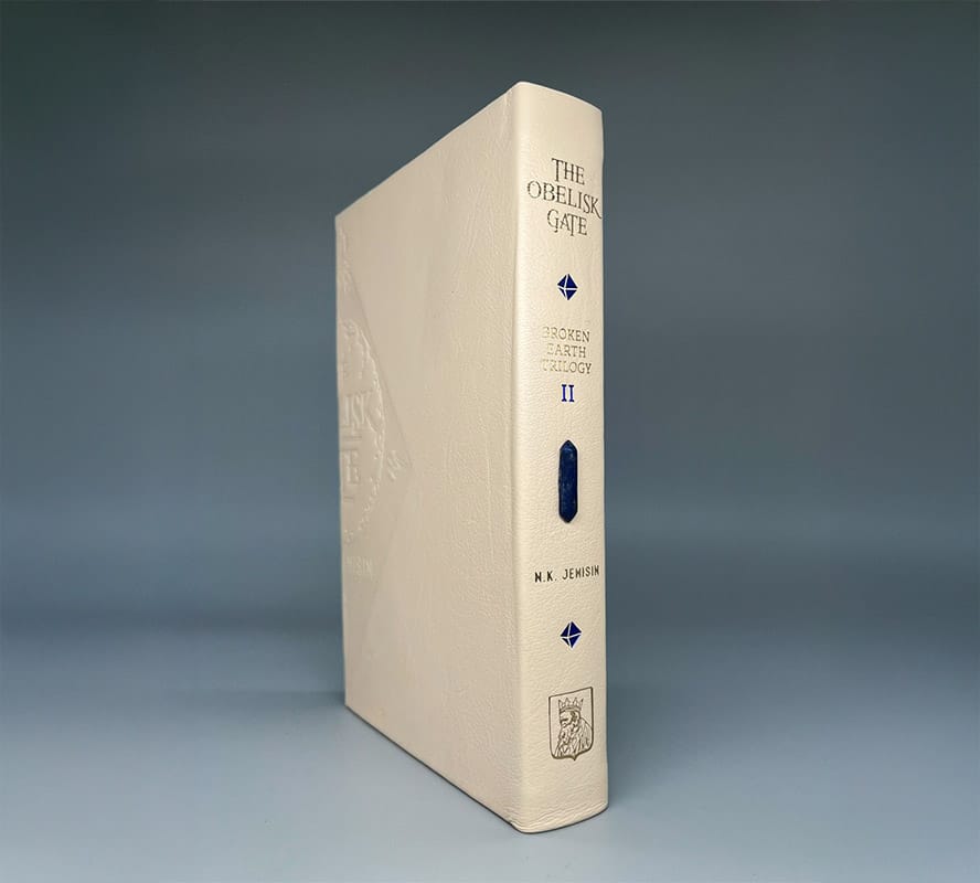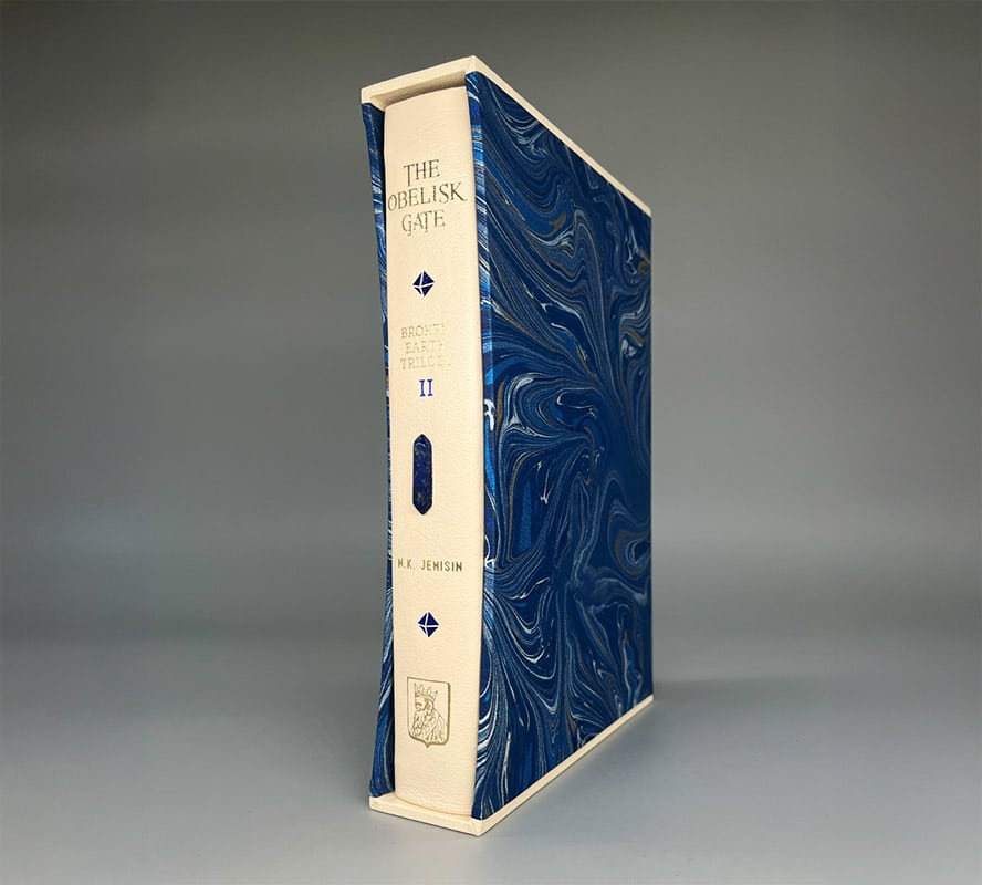 The handmade slipcase is covered in Heritage Regal Buckram bookcloth and has a gold stamped obelisk design on the side. Both book and slipcase are handbound by Ludlow Bookbinders.