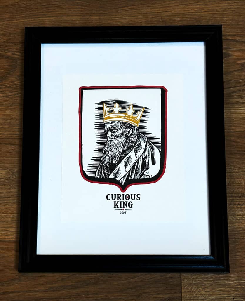 Limited to 200 pins only, these have been made by an independent pin-maker called Zap Creatives! The pin is of course the Curious King shield and made from brass allowing for a shiny crown to match the print.