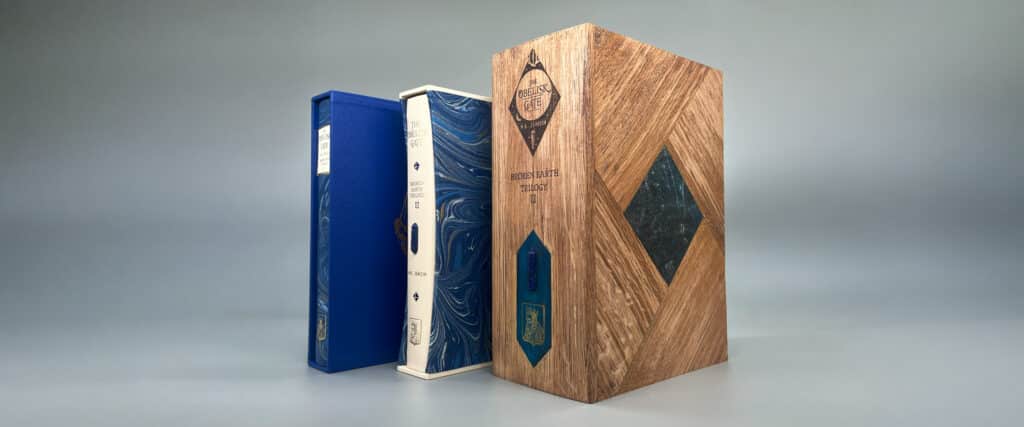 This edition is housed in a curved capped slipcase covered in blue marbled cloth by Freya Scott of Paperwilds and capped with cream leather.