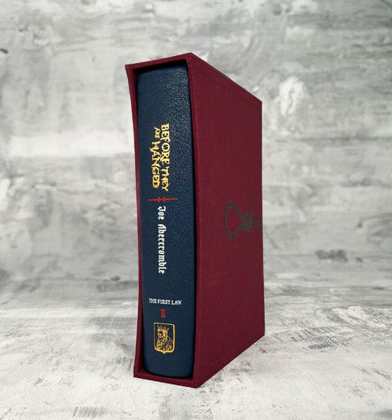 We had originally planned the second book to be a different colour, but then Joe pointed out that if we carry on with the standalones and the final trilogy, the collectors shelf may look a bit like a pack of crayons. So we’re keeping to blue leather for this edition (potentially a different shade), and will switch up the colour for the standalones and final trilogy. Sporting a new “noose” design and three-pass foil stamping on the cover, spine and back.