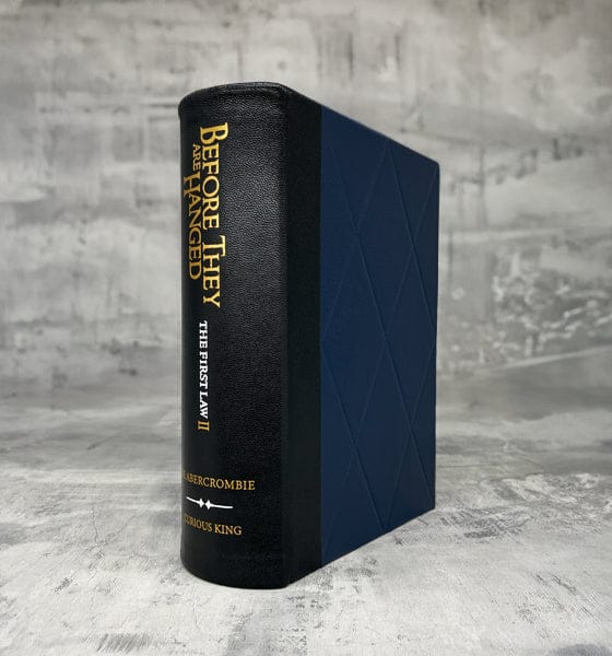 Bound in finest Harmatan black goat with blue leather onlays on the front, back and spine with three colours of foil stamping. It includes 4 raised bands, rounded spine, coloured headbands and all 3 edges gilded gold.