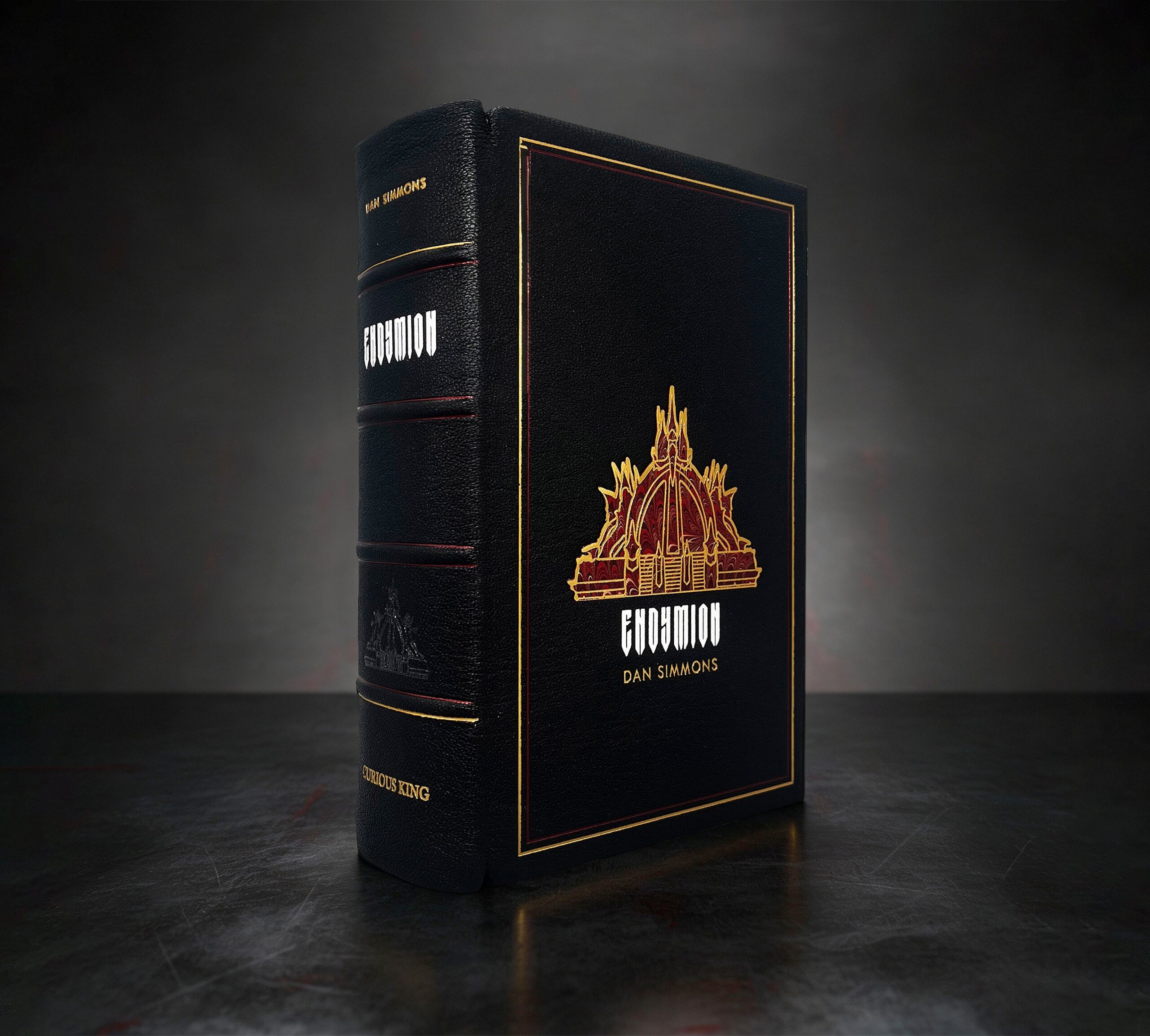 The solander is covered in Harmatan Black and is rounded with four raised bands, has two leather onlay, and the edges are finished by the custom marbled leather also. The front and back cruciform design has progressed from Hyperion’s and Fall of Hyperion (and will continue through all the series).