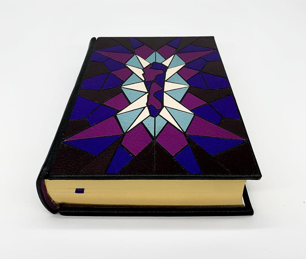Handbound by Ludlow Bookbinders, the front and back of the boards have an incredible 194 separate leather onlays (with raised leather in between) making up a mosaic of the amethyst obelisk.