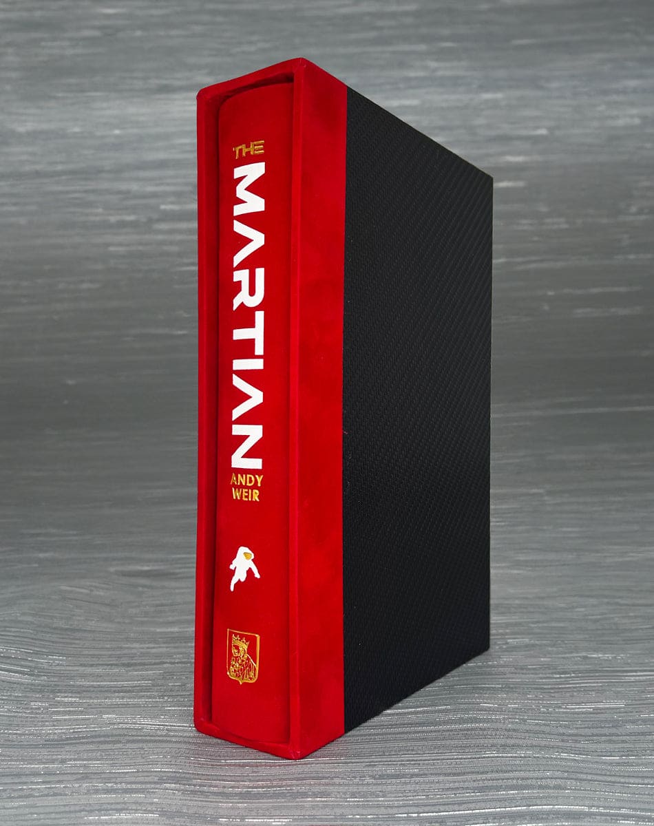 The boards are covered in a deep red “Pivoine” Suedel and comes with a spacecraft onlay on both the front and back boards in Corvon Carbon-X Maroon paper that emulates the style of carbon fibre. The spine has been rounded and comes with two hits of foil stamping as well as white head and tailbands and red ribbon. The top edge has also been hand-sprayed black with red flecks to match the book.