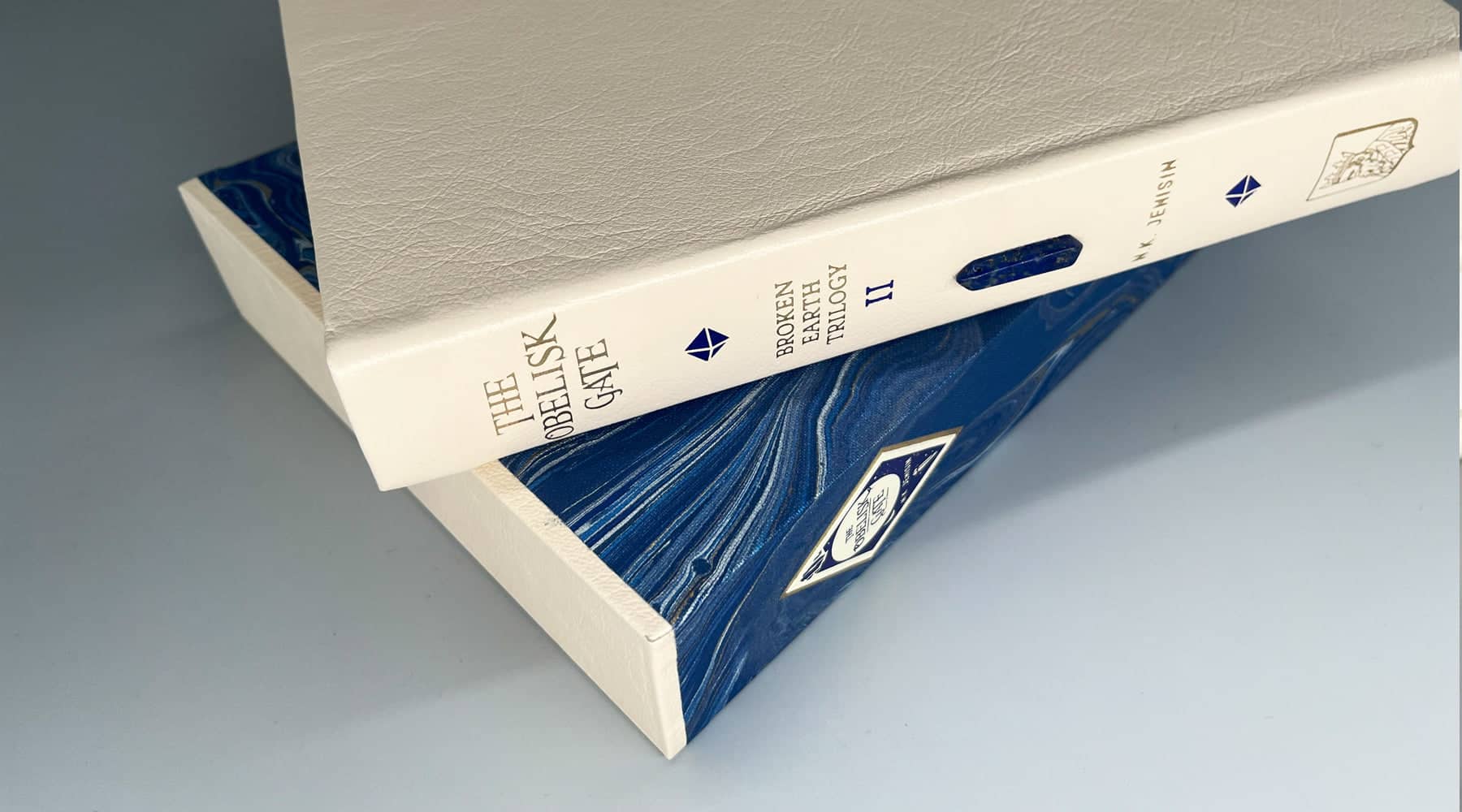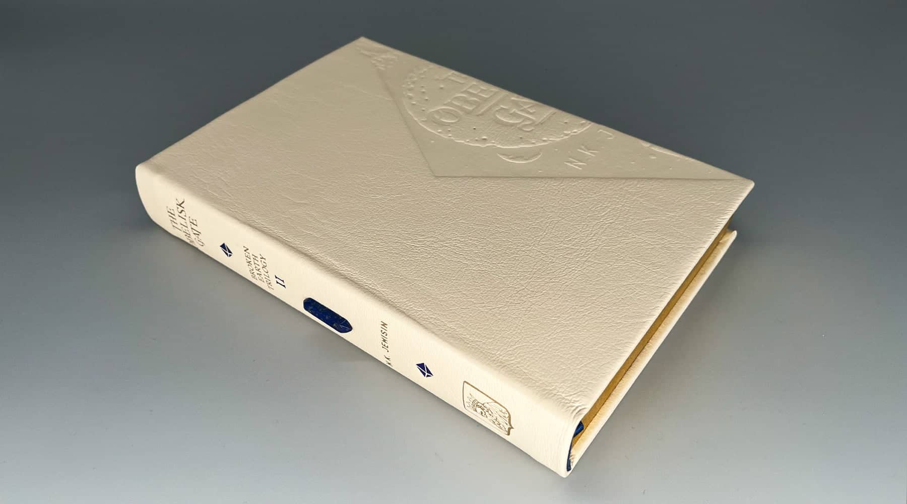 The boards are handbound in a rich cream goat leather and blind stamped on the front and back. The spine is rounded; foil stamped in gold and blue and has a Lapis Lazuli stone point affixed.