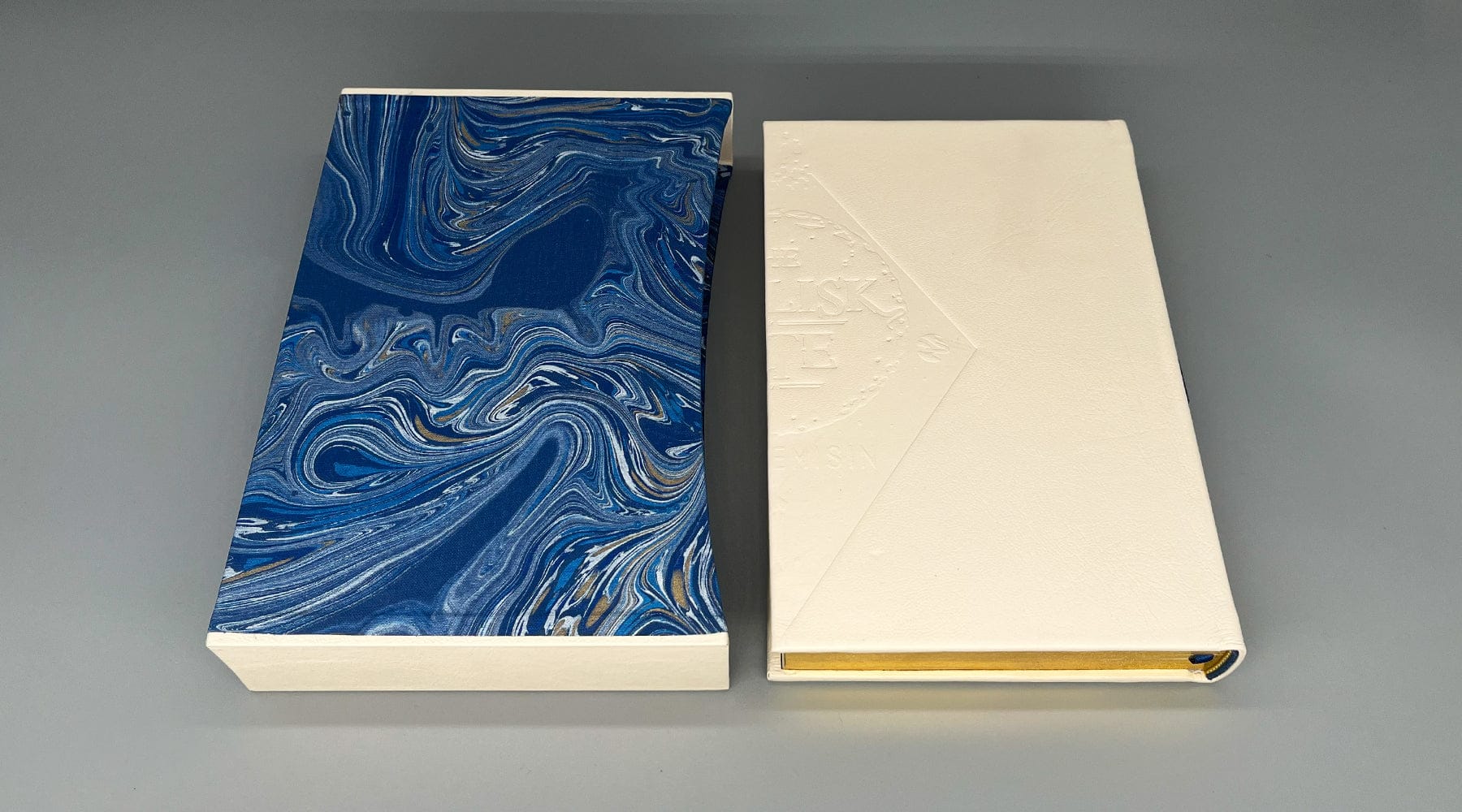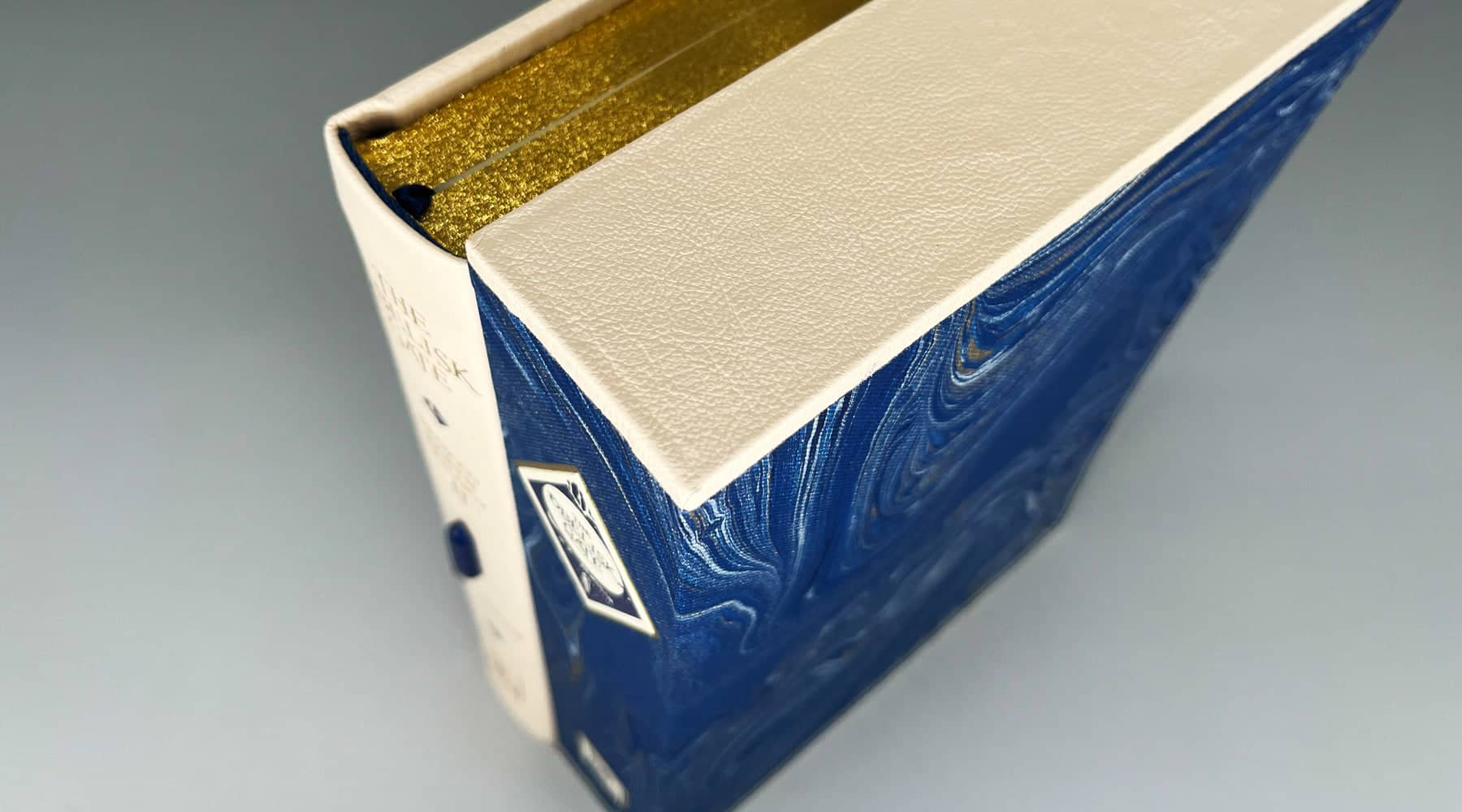 This edition is housed in a curved capped slipcase covered in blue marbled cloth by Freya Scott of Paperwild and capped with cream leather. The spine also has two labels adorn the back. Both book and slipcase are handbound by Ludlow Bookbinders.
